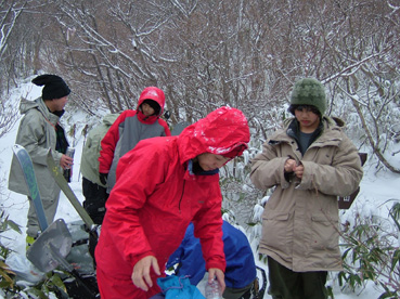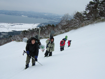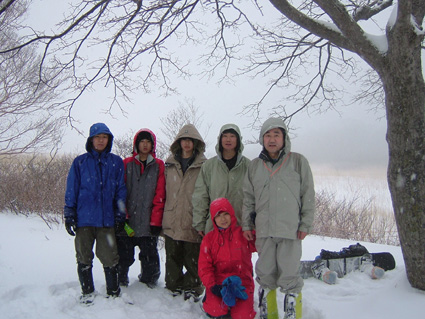 | (@_@) スキー場にて(左から) ゲレンデを登る(Yosi君〜Yosinori君〜Take君〜Tosiさん) ↓ (^_-) Sato君・Yosinori君・爺ちゃん・Tosiさん・Taさん・SEI・Take君・Yosi君(間違ってたらゴメン) |