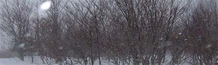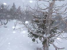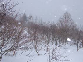 ただ灌木の木立が行く手を阻む 降りしきる雪で視界が悪くコンパス頼りの進行方向