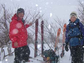 美味しいビールでご苦労様と乾杯 粉雪舞う山頂の展望は無かったが