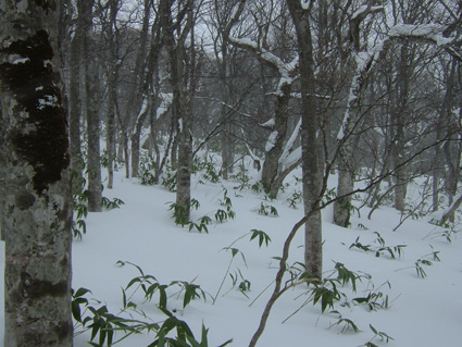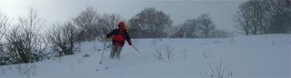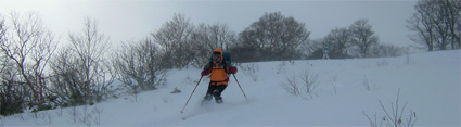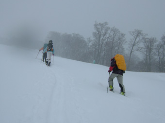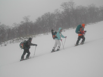 ![]() 閉鎖中のゲレンデを登る 荒れたゲレンデ(山スキーの入門コースに最適) 気持ちよく登れました ![]() 新雪はキラキラと光!!ふらふらと舞えおりる雪 ゲレンデピークの登山口(Masa・ojyou・Hirorin) ![]() ブナ林の山腹(1500m付近) シールワックスを塗るMasa ![]() スキーを外すと腰まで・・・・(>_<) ← MASAさんの滑り(^-^) ← ojyouさんで〜す(^^) ← Hirorinで〜す ![]() ![]() ↑ GPSで軌道修正 中腹でランチタイム(この後 降りしきる雪で撤退) 郡山をAM7:00に出て赤面山にはAM9:35に到着 準備を整えAM9:50登りはじめる 登り初めからの雪 閉鎖されたスキー場は銀世界へと私達を招く 粉雪が舞う赤面山へ ゲレンデピークに登山口の案内板が顔を出していた 此処からはブナ林 雪化粧の大地にブナ林!!飾り気のない自然を風靡し爽やかな心に成れる瞬間でも在る 山頂手前50m地点は笹原に新雪が被さる程度の積雪 スキーを外すと 腰まで潜る 安全登山を考慮し此処から下山開始する 粉雪の積もる山腹をスキーが走る Masaさん ojyouさん Hirorinさんが気持ちよさそう 荒れたゲレンデは山スキーに最適 雪煙を上げて滑降する様は雪に舞う妖精(チョット誉めすぎ)の様だ!! ゲレンデ中腹でランチタイム の は ず が・・・・降りしきる雪で遭えなく撤退致しました 下山後 大丸温泉に泊まり宴会&温泉で極楽の1日を閉じる MasaさんojyouさんHirorinさん有難うございました ・・・・SEI・・・・ |