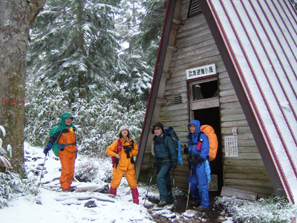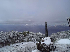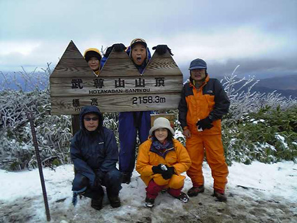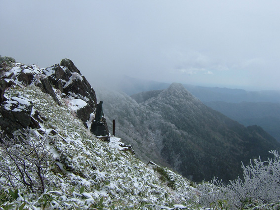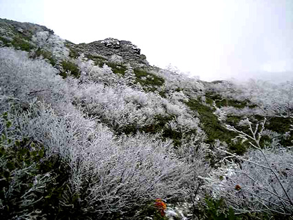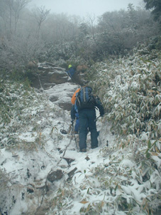 ![]() 麓の紅葉 ![]() 雪の降る登山口(SUMIさん TAKIさん Mihorin TETUさん ごんぞうさん) ![]() 遊歩道を登る 次第に雪化粧になる白樺林 ![]() もみじの赤に化粧を!! 遊歩道も終わり登山口が現れる ![]() ロケの標識 ↓ 案内 ナナカマドの赤い実が引き立つ初冬 ![]() ロケの内容 道標 避難小屋にて ![]() クサリ場 滑る急斜面 稜線に出る ![]() 三ツ池の一つ 稜線より越後の峰 ![]() 武尊山 ![]() ![]() 山頂 ごんぞうさん TETUさん TAKIさん SEI SUMIさん Mihorin ![]() 獅子ヶ鼻山 ![]() 遠望に谷川岳 ![]() 樹氷 クサリ場を下る ![]() 初冠雪の武尊路 一ヶ月ぶりの登山になりました 22日午後に郡山を出発した 東北道を上り群馬県片品村へ向かう 雨が車の窓にぶつかる音が大きく聞こえる 週末に成ると天気が悪くなるパターンが続いてる様に思いた スムーズに走る車窓からは紅葉した木々が雨に打たれて鮮やかに映える 赤が綺麗だ!黄色が輝く!色つき始めた葉が可愛い麓も間もなく向かえる錦秋の足音が聞こえてくる。 日光いろは坂にさしかかると渋滞に巻き込まれる 動かない車、ただ車窓から見える紅葉がいらだちを緩和してくれる 中禅寺湖の周辺は渋滞で車が溢れてる 駐車場に入れない車や行き交う車が鉢合わせ状態で進まない 中禅寺湖の紅葉は盛りの様だ、遠望の山並みも鮮やかに染まる思わず大きな声 (ウワー綺麗だー 凄いなー 赤い実が 落ち葉が 草紅葉がと見渡す限りの黄金色に感激するメンバー) 戦場ヶ原を過ぎて金精トンネルを越すと菅沼〜丸沼〜大尻沼と右手に見える 間もなく片品村に到着だ 日光白根山の裾のを通り本日の宿に着いたのはPM5時周りは暗くなり始めていた 宿では前夜祭の酒盛りで乾杯〜 持ち寄った料理や飲み物がコタツの上に並べられた 美味しい料理の数々、ごちそうさまでした・・・・・(~o~) 夜中に雷の轟音が宿の窓を振るわせる、光が走る・・・が・・・皆さんは寝耳に水の爆睡 (笑) 翌日6時に宿を出る、登山口に6時30分到着の予定が道を間違えたSEI 一時間のロスタイム、東俣登山口に着いたのは7時30分になり登り始めは7時50分、ご免なさい皆さんm(_ _)m 駐車場周辺の木々は見事な紅葉で染まる 特にナナカマドの実が赤く輝き降り積もる雪とのコントラストがマッチして素晴らしい 登山道を登り始める頃になると雪が多くなり道に添えられたモミジの葉に重なる雪が一段と赤を強調させた 遊歩道の分岐に着く、ここからは白樺の林に囲まれた見事な道が続く、初冠雪のプレゼントを頂き 一度に二度楽しめた武尊山登山 晩秋の山と初雪の白が重なり 山頂へのパノラマを感動する時間と夢に変えてくれました。 ぬかるみの登山道は何処までも続く、足首まで潜る道に足を取られて転ぶメンバーの姿が!! それでも歓声は続く、ガスに包まれた山肌の奥に見えない景色!! 足元には白い妖精が降り立つ クサリ場を見上げれば寒さで凍り付くロープが此から登る私達を待っててくれました。 山頂が近づくにつれて樹氷の輝きが増す、時々太陽の明かりが稜線を照らす うっすらと現れる峰に視線が釘付けになりカメラを取り出す動作がもどかしい、瞬時で消える大空間の峰が幻のように脳裏に残る 残らないカメラ画像が恨めしい 山頂まで後20分の位置に着く 今までガスに覆われた山々がスクリーンに映し出されたように現れた 太陽が顔を出す 遠望の山が見えた 切れ落ちた谷の空間が紅葉した様や雪化粧の山肌が!! 凄い待ちかまえたような時間と360度の空間が私達の目の前にある 富士山〜谷川岳〜至仏山〜越後の山々〜等々と素晴らしい景色が飛び込んで来ました 山頂には数人の登山者が休憩しています 食事をしてる人やカメラアングルに夢中になる人と様々な動き 私達も記念写真を撮り休憩 私は今回の登山にもう一つの願い事がありました それは今月の3日に旅立った母の山頂供養であります(母は山歩きが大好きでした) 母の分身と共に登って来た私は、仲間にお香を焚いていただき母の好きな饅頭とお酒と煙草を供えて 供養をさせて頂きました。 皆さん有り難うございました・・・・・・m(_ _)m 山頂滞在は20分ぐらいで下山する(風が強く寒いため) 足早に下るメンバーが時々立ち止まる!太陽に照らされた樹氷の輝きに心を奪われて静止 放射線状に反射する光線が山肌を眩しくする 綺麗だね〜とSUMIさんがしみじみと語りかけた 避難小屋で遅い昼食 外で食事の私達の上に樅の木?から滴が落ちる 衿から冷たい滴が入る みそ汁には飛んできた小さな実が泳ぐ、ビールと共に胃袋に入る気にもせずに!! 初雪の武尊山とも間もなくお別れだ どろんこの道に足をすくわれながら無事に登山口に着いたのは 午後の4時20分 薄暗くなってくる時間帯に成る 登山口の小屋で汚れた靴と雨具の泥を落とし 帰路の道で温泉に浸かり蕎麦を食べ生ビールで仕上げる・・あ〜極楽極楽 ご同行の皆さん有り難うございました 母の供養を頂き感謝致します ・・・・SEI・・・・ 戻 る |