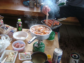 ぼんやりと霞む中 小屋が現れる さー昼飯だと、なだれこむメンバー
