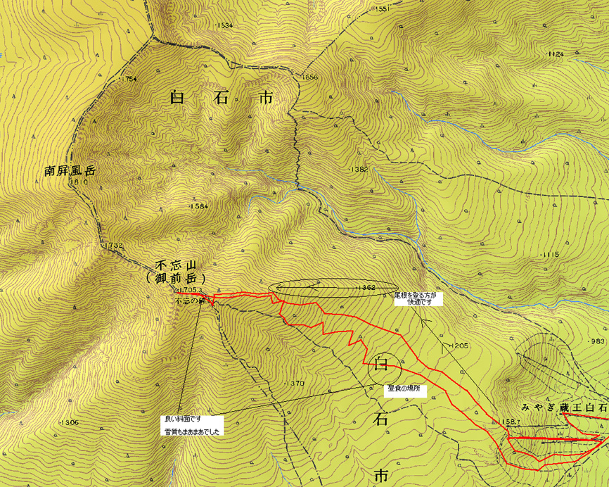 今回のコース 不忘山(GPS) 戻 る 登り リフト終点 8:50〜山頂 11:50 〜 休憩 10分 〜 下山 12:00〜 下り 12:00 〜 1237m付近(昼食 13:02〜14:30迄) 〜 駐車場 15:30