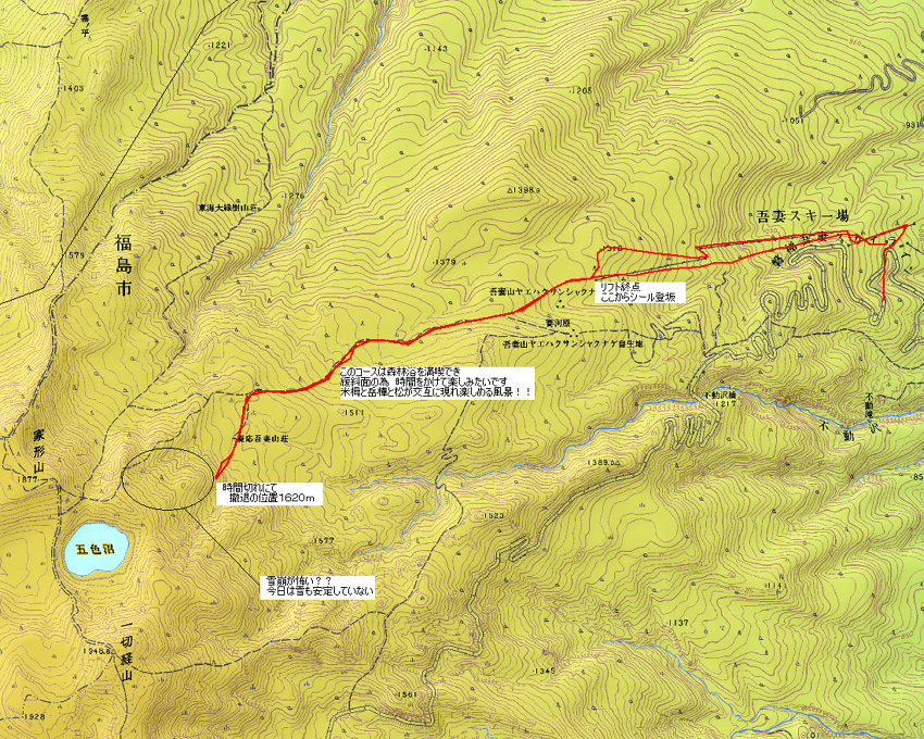登り リフト終点 AM9:30〜 吾妻山荘 AM11:00 〜 撤退位置(1620m)11:50〜休憩〜 降り 1620m12:00 〜 リフト終点 12:47 〜 駐車場 12:58 〜 レストランにて休憩