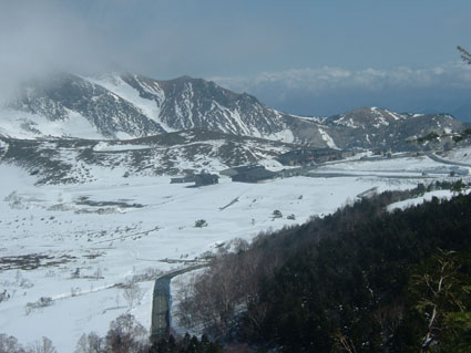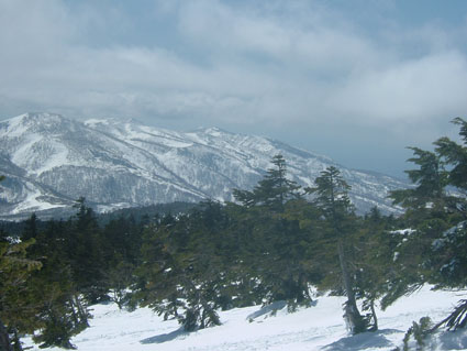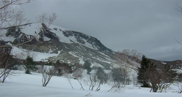 左に前大巓〜右奥に一切経山 東吾妻山(一年を通して黒く見える山)