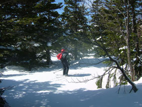 休憩を終えた私たちは滑降開始 案の定、重い雪に難儀し林間を下り