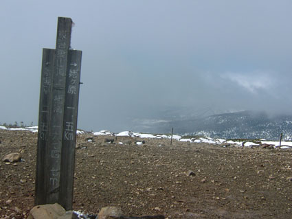 山頂の木々にはエビの尻尾が見られる 道標と雪のない山頂