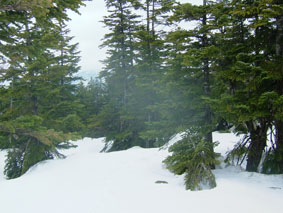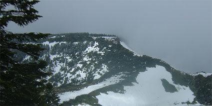 新雪に足跡を残し第一の目的地「一切経山」に着いた ガスが流れて峯峰がスライドの様に現れる