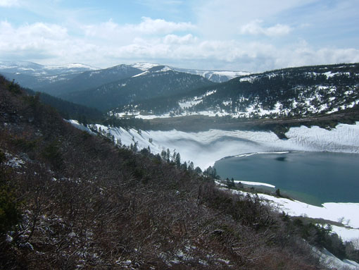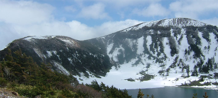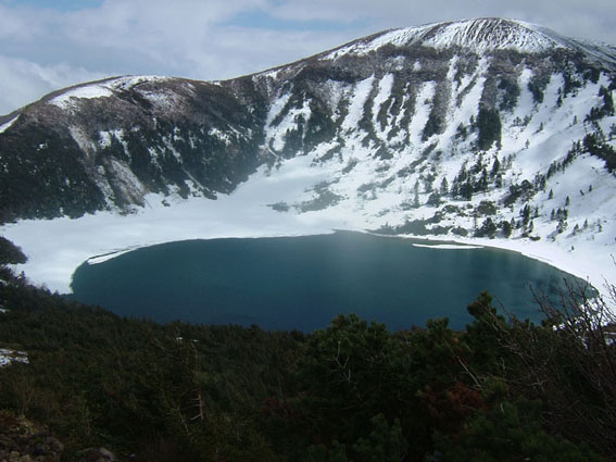 五色沼の下りは残雪歩き 時々雪面が抜けて面白い・・(>_<)・・かな