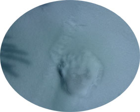 新雪の上に熊の足跡が点々と道を引き、右に左に彷徨い足跡が続く 笛を吹き熊を威嚇