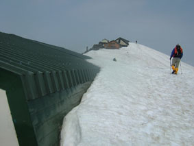 頂上小屋は雪の下(奥に月山神社) 山頂より(左奥は湯殿山〜右に品倉尾根)