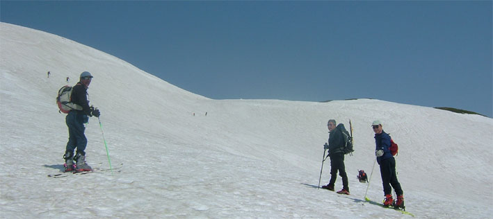 途中にデポしたスキーを履いていよいよ滑降準備 大斜面が美味しそう