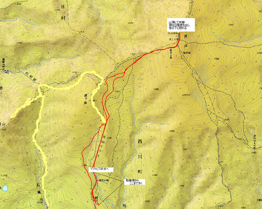 登り リフトAM 8:42 〜 終点 AM 9:00 〜 牛首 AM 9:40 〜 鍛冶小屋跡 AM 11:25 〜山頂 11:40(休憩) 下り 山頂 PM12:16 〜 牛首 〜 ゲレンデ 〜駐車場 13:30