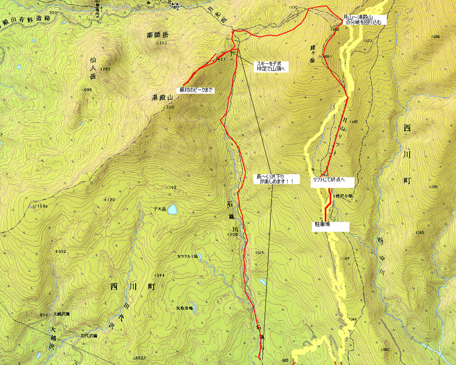 スキーデポ地点(沢最上部のコル)10:20 〜 湯殿山ピーク AM 11:29〜(休憩11:40分迄)
