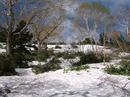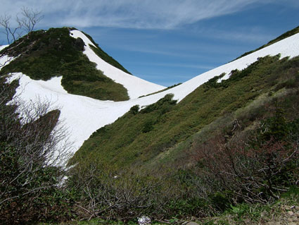 燧ヶ岳に訪れたのは去年の6月20日以来です 去年は残雪も殆ど無く夏道歩きに終始したのを思い出しながら歩きました 今年は御池駐車場に雪の壁があり 燧裏林道分岐をすぎて間もなく雪渓歩きになる 雪渓歩きは楽だが滑る・・注意が!! アイゼンを付けるほどでもないと中途半端だ 時々抜ける雪渓にウワ〜と声が出る???何事もなく歩く・・・SEI 駐車場には多くの車が駐車されていたが登山者には会わない 早出したのかそれとも尾瀬沼側からの登りなのか? 広沢田代で休んでると3名の登山者が下りてきた 今度は御池登山口から登って来た単独の登山者が2名追い越して行った 休憩もそこそこに立ち去る姿 元気なお人だな〜と見送る (^-^) 湿原には小さなミズバショウとショウジョウバカマが咲き始めてた ワタスゲの頭も大きくなり間もなく一面を白く彩るだろう 花の季節には未だ早いようだ!! 木道を進み樹林帯に入ると雪渓歩きになる 数メートル雪が残る場所が多く これからでも山スキーが出来るとルートファイデングをするSEI 見上げると空間が現れる 熊沢田代に着いたようだ 1m位の段差を登りヒョッコリ頭を出すと燧ヶ岳の勇壮が現れる 白い溝がいつもの年より 鮮明に浮き出てる 残雪の絵模様が残る山肌に季節の遅れが見られた 急登の谷に残る雪渓を3本渡りいよいよ山頂だ 張り出した樹木のアーチを潜り岩場に出る 山頂でくつろぐ登山者の声が聞こえる 大きな岩にしがみつき一力入れて上がる そこには東北の最高峰360度の展望が約束されていた。 ガスが悪戯する”カメラアングルに白い影 あ〜残念とため息を!! でも安心出来る今日の天候、数秒でガスの意地悪から解放され 山頂の楽園に歓喜が聞こえる 汗まみれの体は直ぐに冷える ウエアーに身を包み防寒し食事をとる ビールに少々の日本酒を頂く つまみに定番のガーリックパンとソーセージ とても合う組み合わせに一時間の休憩は短く感じました 山頂を後にして尾瀬沼に下る 長英新道の長いだらだらと続く登山道を思い出し気合いが入る テンポが速くなる が 途中のお花さんがお休みくださいとばかり咲いている 可憐な白 薄紫 黄色 など道草には有り難い呼びかけを無駄には出来ない 小さな花に向けられるレンズ 恥ずかしそうに下を向く花弁に苦労をしてシャッターを切る 雪解けの水が音を立てて流れる登山道 時々雪渓に惑わされてコースを見失う 笹藪を越えてルートに戻る 長〜い 長〜い 下りも終わり尾瀬沼に着いた 木道に出ると大勢のハイカーが探索を楽しんでいた 巻き込まれて歩くのに苦労をする 沼には数種類の花が咲き登山道には無い賑わいを見せていた 休まずに沼山峠の終点に向かう 峠の休憩所には溢れんばかりの人が右往左往 大型バスの送迎を待つ人や待ち合わせの登山者なのか ここでも休憩をとらずに御池に下りました 国民宿舎御池ロッジにて風呂に入り(500円)帰途につく 天候に恵まれた一日でした・・・・SEI・・・・ |