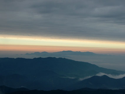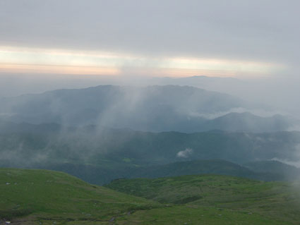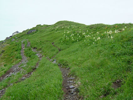 24日月山 月山の夜明け ![]() 山頂小屋とバイオトイレ 小屋の道標 ![]() 月山山頂神社 山頂よりの展望 1909mのピーク(稜線に咲く花) ![]() 月山山頂を望む 残雪を登る登山者 いろは四十八沼 起床AM1:00寝ぼけ顔でおはようございます 2:00には宿坊を出る バスに揺られて月山8合目に着くAM2:50 早速身支度を済ませて登山道を出発した 暗い夜道に懐中電灯を照らし登山道を進む 木道を渡り いろは四十八沼の在る 湿原を渡りいよいよ岩場の登山道 加工された石や岩が並べられて 歩きやすい 所々水たまりが在るが苦にはならない程度だ! 仏生池小屋に着くが休まず登る 先頭を登る参拝者に追いつき挨拶を交わし 先行させていただいた。途中で日の出の時間 ガスが赤く染まる 短い時間では在るが太陽も顔を出したので手を合わせる「お祈り」パチパチ 山頂に在る月山本宮神社に着いたのは一番目の様だ 神社の係りの方が現れたので杖に焼き印をお願いした 後続の仲間が着き合同でお参りを済ませた。 山頂に在る小屋で冷えた体を中から暖めるために熱燗を一杯頂く ウメーと声を出してしまうSEI 何時の時もお酒は美味しい 至福の時が過ぎて下山 山頂を後にしました お花は少ない 残雪は例年よりは多いそんな印象が強く残る三山巡りでした。 (>_<) 登る途中に携帯電話を落とす が 戻り竹笹の中を探し 数十分かけて見つけた あ〜〜良かった 今年は運が良いかな (^O^) 戻 る |