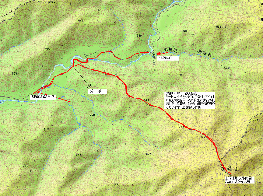 今回のコース 戻 る 駐車場 AM7:40〜分岐8:00〜山頂12:15〜休憩(20分)〜 下山 12:35〜分岐15:20〜角楢小屋 16:00〜(渓流釣り一時間)〜 角楢小屋 17:20〜駐車場 18:00〜白い森オートキャンプ場 18:40(テン泊)