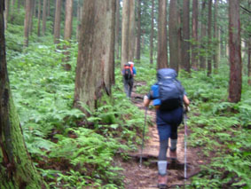 ![]() ![]() 駐車場手前の橋 二王子神社の入り口の看板 ![]() 神社脇に奉られてる清流 二王子神社 ![]() ![]() 杉林の登山道を登る 椿の実? 蝉の抜け殻 ![]() 一王子小屋 ![]() 五合目には休憩スペースが在ります 岩登り 八合目(ここから低木で視界が開ける) ![]() サンショウウオの住む池 9合目の?建物 二王子小屋 ![]() 二本木山方面が瞬時 現れた 山頂に在る青春の鐘 ![]() 山頂にて 山頂に刻まれた文面 ![]() 突然現れたサルの軍団の一匹 ![]() ニッコウキスゲが咲いていました(ん〜遅咲き?) 下山道より(新潟平野) 曇り空の下 蒸し暑い登山道を登る 清流が流れる二王子神社脇を進み杉林の中に入る こけむした木々や岩が目に付く湿度が高い山域なのか?登山道は手が加えられて登りやすい ただ登山者は2名しか見あたらない あまりメジャーではないのか? (テン泊して次の日の朝に解ったのがメジャーな山で在ること、数十台の車が並んだ) 登山口には案内板があり登り4時間 下り2時間30分と印されていた さほど急登ではないが長い道のりである 一合目ごとに区切り板があり2〜3〜4〜合目と 五合目でいつものビールタイム 豊富に持ち込んだ果物を食べて30分の休憩 少し休みすぎとペースを上げる 登山道はブナ林の二次林と思われる細い木々が多い 8合目に着くと低木になる 視界が開けると共に爽やかな風を体で感じることが出来た ニッコウキスゲが咲き始めた谷が覗ける 開花が遅いのではと呟くSEI 途中にはアジサイが満開 この時季はずれのアンバランスが感性をくすぐる!!! 8合目を過ぎた所で今日三人目の登山者に会う 9合目の石祠を写真に納め山頂へ 山頂は青春の鐘がガスに霞みぼんやりと映し出される 広いピークに三角点 ボーイスカートの設置した方位板と風景が目に飛び込んだ。 爽やかな風のピーク! 流れる 押し寄せる 波のようにガスが! 微かな空間に瞬時現れる峰に、表情が! ただいることに満足を頂き幸せを感じる、無意識の意識の中に! 疲れた体が解放される瞬間! だから山は止められない登ることより下ることよりこの瞬間が在るから! 途中の景色を思い出し 心ときめく憧れの道のり! 山はすべて平等に与えてくれる優しさがある! そんな山が在る限り登り続けたい! ・・・SEI・・・ 山頂で休んでいると三名の登山者が着いた これで今日会った登山者は6名 30分ほど休憩して下山していきました。 SEIはまだ下りるのは早いと一時間半の大休憩の後に午後一時に山頂を後にする 下山途中でサルの大群に出会う 子連れのサル軍団を確認し 静かにサルのを(去る)待つ 毛並みの良いボスざるらしき一匹を写真に治めた 下山口へはPM3:30到着 テント場へ 渓流釣りをする予定で今日も同じ場所にお泊まりに成りました。 二王子神社登山口への道順が解らず迷いながら夜中に着く 今回のコースに案内文を書きましたので初めての方は参考にしてくださいね! ・・・・SEI・・・・ 戻 る |