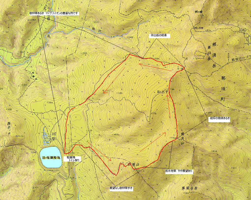 今回のコース(GPS) 戻 る 駐車場(沼原登山口) AM8:30 〜 白笹山 AM9:20 〜 南月山 AM10:50 〜 日の出平 AM11:05 〜 牛首 AM11:17 〜 姥ヶ平 AM 11:48 (昼食)〜 駐車場 13:00
