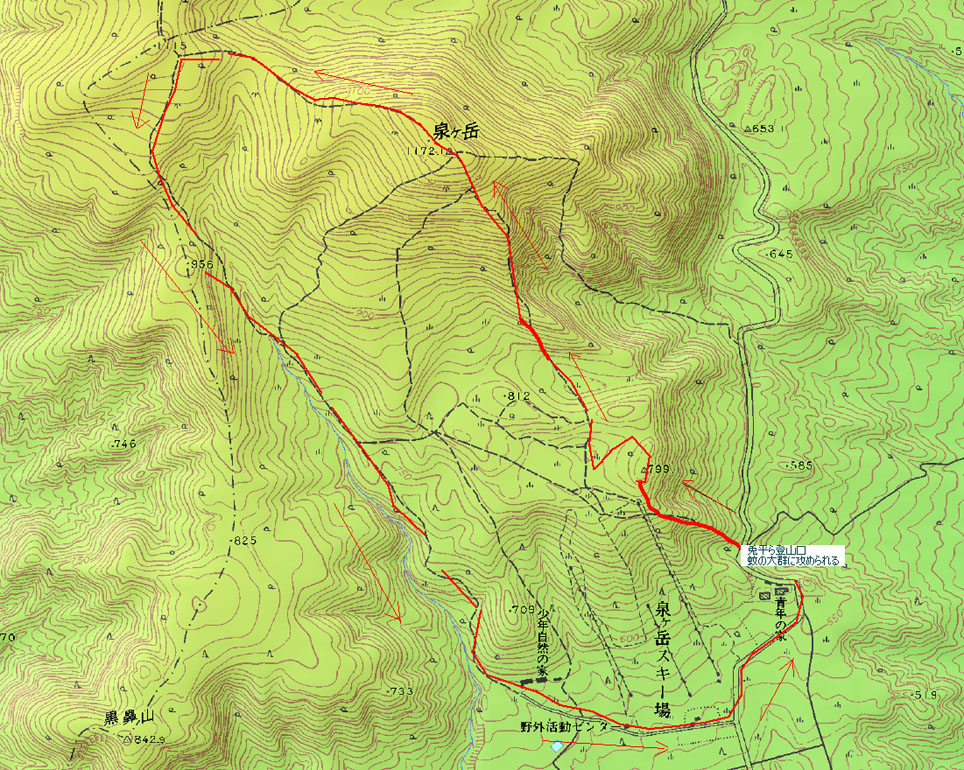 今回のコース(GPS) 戻 る 登り 兎平ら登山口 AM 9:15 〜 兎平ら AM 9:50 〜 岡沼 AM 10:00〜 山頂 AM 11:00 〜 休憩 (11:30分迄) 下山 山頂 AM 11:30 〜 北泉ヶ岳分岐 PM 12:13 〜 少年自然の家 PM 13:37〜 青年の家 PM 14:06 〜 登山口へ PM 14:15