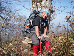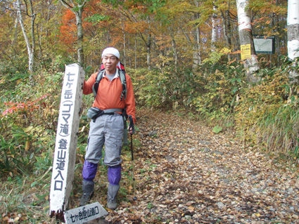 ← 針生登山口で 登山口は紅葉の盛り 折れた標注を立てて 記念写真 これから護摩滝目指して出発のSONEさんで〜す |