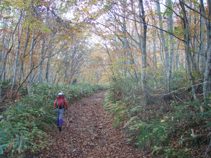 | 落ち葉の積もる登山道 → 沢筋に取り付くまではご覧のような広い道です |