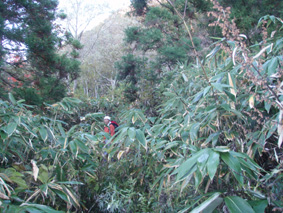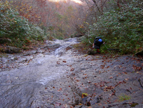 ![]() 沢筋の登山道に入ると笹の生い茂る藪になる |