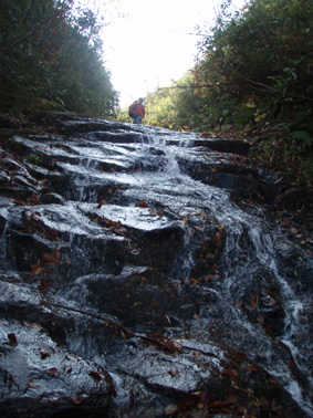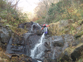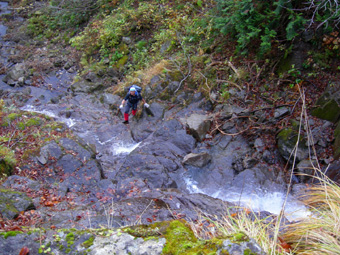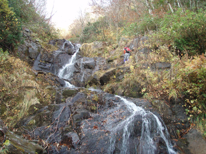 ![]() 護摩滝上部につながる急な滑滝を登る |
