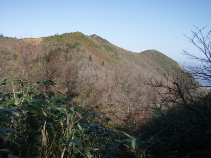 青い空に聳える 広葉樹の葉は落ちて笹原の緑が稜線を縁取る その姿が誇らしげに語る、無名のピークは寂しいと!