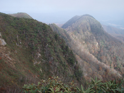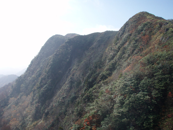 | 切れ落ちた岩稜線 → 七ヶ岳の写真中央コルは越路と言い 熊さんが越えることの出来る唯一の鞍部らしい! |