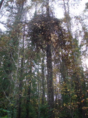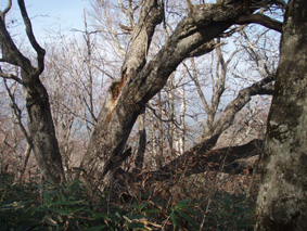 | 熊 棚 → 杉の木に絡まるブドウのツタを手繰り寄せた跡があり 数本の太い枝が無造作に折れて棚から突き出てる 木々の実が不足して熊さんの食べ物が少ないようだが 此処でも熊さんの苦労の跡が見られた |