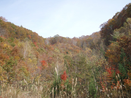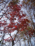 ← 林道に出ると西日に照らされた斜面が紅く染まる 素晴らしい紅葉とは言いがたいが彩りは鮮やかだ! |