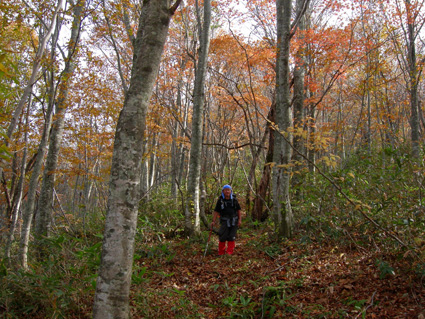 ← 広大な西斜面 西日が降り注ぎ木々の彩りが浮かぶ山肌 |