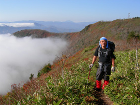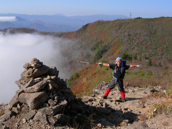 ![]() 稜線に出ると其処は高杖コースの分岐 東に折れて進めば事なくして賽の河原に着く 雲海越しに男体山を初め日光連山や越後の山々を望む事が出来た |