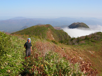 ← 七ケ岳山頂から下岳への稜線を見下ろす 奥には雲海に飾られた七ヶ岳の連山ピークが見える 北には雲に隠れた飯豊山 ? や会津の山々が現れ 東には那須連峰の連なりを望むことが出来ました |