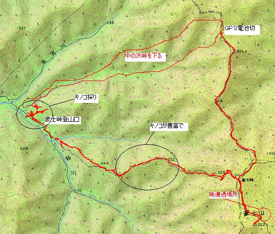 豪士峠コース登山口 AM 9:40〜豪士峠 PM 12:50〜山頂 PM 1:10〜小休憩〜 峠分岐 PM 1:30〜中ノ沢峠 PM 2:40〜電池切れの為トラック不明〜 中の沢登山口 PM 4:15〜駐車場 PM 4:30 ※ コースタイムは全て途中のキノコ採取時間も含まれる ※ 山頂直下で熊と遭遇 (道標に熊の爪痕と破壊箇所在り)