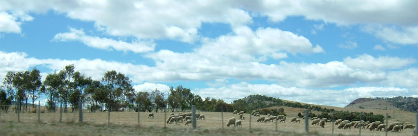 ハイウェーの車窓から眺める風景 (広大な平野に放し飼いされてる羊)
