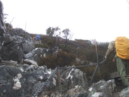 小屋を出るとますます雲行きが悪く 稜線は隠れ雨が強くなる 目指す山頂は目の前と足取りも軽やかに (>_<) ??