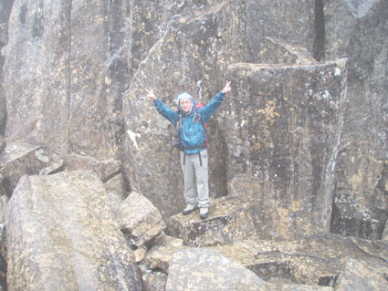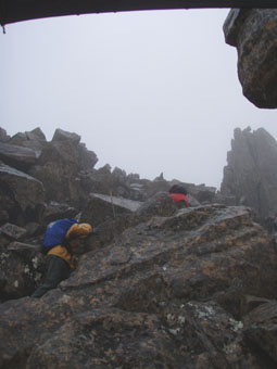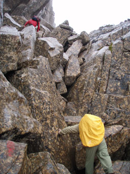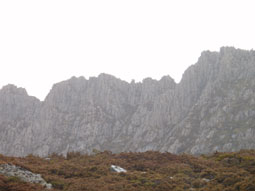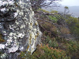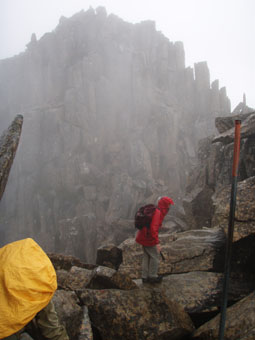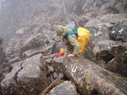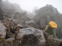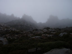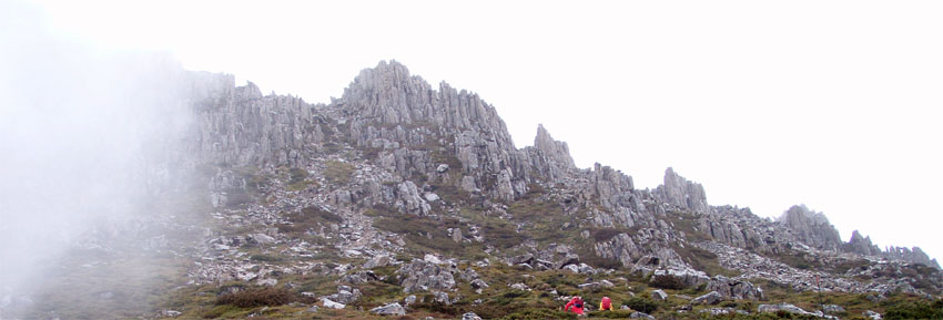 足下には空洞が 一度滑れば間違いなく帰れない 緊張の連続です 足場が無く苦戦する所多く 滑る岩を抱き頬を寄せる ガスと雨が追い打ちをかけ 目指すピークを拒む ! 山頂は前方のピークの後ろダ!! しかし雨で滑る岩にガスの急襲 心を鬼にして撤退した クレイドル・マウンテンよ有り難う |