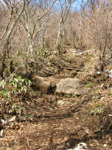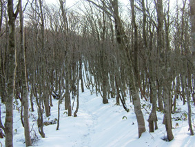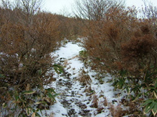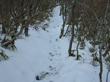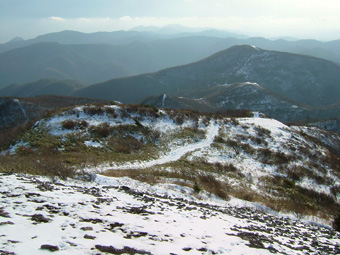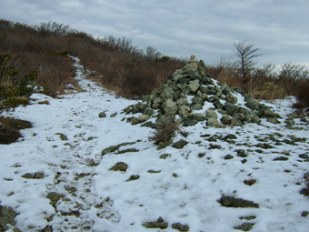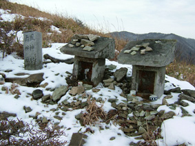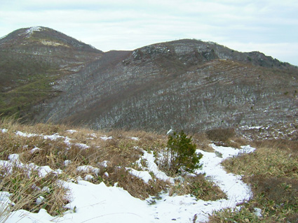 ![]() 御霊櫃峠 峠の登山口 奥に見える大将旗山 ![]() 稜線より猪苗代湖 初冬の景色 ![]() 雨と風の神様が奉られている 登山道 途中の数カ所にケルンが有りました ![]() 日当たりの良いところは雪が消えている 天高く突き出てる大岩 雪道に変わる ![]() 灌木の林 山頂より磐梯山の勇壮 ![]() 山頂より(左から箕輪山〜鉄山〜尖りは安達太良山〜和尚山) 山頂の道標 奥に額取山(安積山) 下山路の奥に三森山のピーク ![]() 稜線を醸し出す午後の日差し SONEさんから山のレポが届いた 写真を眺めレポを読んでいたら無性に山肌が恋しくなり突撃 午後の奥羽山脈は強い日差しに照らされて初冬の模様を醸し出していた 御霊櫃峠の登山口に着いたのは午後の一時四十五分 長靴を履いて作業着の姿で登りはじめた 風もなく暑いくらいだ ジャンバーを脱ぎ体温を調整するが暑い 額からは汗が落ちる日陰に入ると気持ちが良い 午後のスタートと言う事で早足で歩くため体温がドンドン上がる ふあ〜〜〜暑〜〜〜〜い (*_*) 稜線歩きにも係わらず風が無く・・・・・・冬の気温とは思えない そこに飛び込んでくる遠望の峯々 日差しを受けて輝く山容は圧巻である 足下の雪に残る動物の足跡を追って目線を移す 動く物は居ないか興味深く見渡す その時目の前を素早く横切る物体 な・なんだ〜〜〜今のは (@_@) 枝にぶら下がり止まる姿は・・・・・・お〜〜〜 雪の原を彷徨う・・蛾!! でした 大げさにすみません m(_ _)m 反省 ケルンや祠そして大岩を通り過ぎ山頂へ着く 山頂は正に大展望の山ダ 那須方面や南会津方面は逆光に霞み墨絵のような風景が波打ち連続する 一人感極まり佇む、素晴らしい風景に抱かれて! 北に目をやれば磐梯山の勇壮や安達太良山の輝く峰が飛び込んできた 短時間でこれほどの展望を約束してくれる山は 他には無いだろう 誰もいない静かな午後の山あるきでした。 ・・・・SEI・・・・ 戻る |