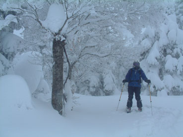 ゲレンデを下るが視界不良で行き先が解らない左右の木々を頼りにのろのろと滑るのは疲れます