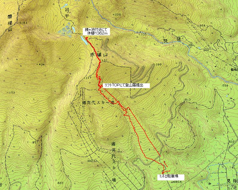今回のコース 戻 る ミネロスキー場 9:20 〜 リフトTOP 9:35 〜 赤埴山頂 11:56 〜 鏡ヶ池付近(休憩11:00〜11:30) 〜 赤埴山頂へ戻る 11:53 〜 リフトTOP 12:20 〜 ゲレンデハウス 12:50 〜 ハウスにて休憩でした