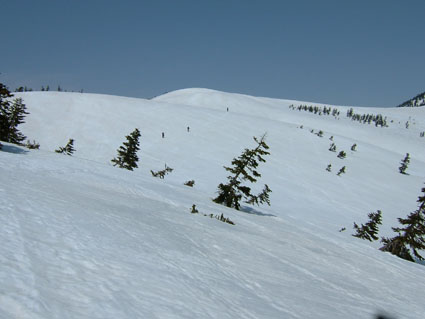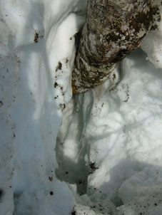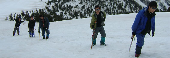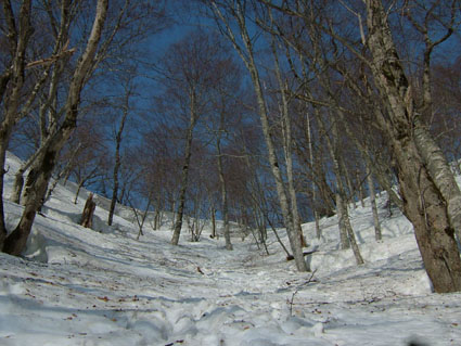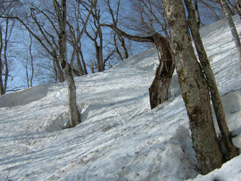 ![]() 駒ヶ岳山頂(道標は雪の中・・) ![]() ブナの幹は雪解 斜面の残雪とブナ林 ![]() 谷筋を登る ![]() 雪面は口を開けていた 夏道の合流地点 ![]() 大戸沢岳方面(雪面に亀裂が走ってる) ![]() 燧ヶ岳 ![]() 奥のピークが駒ノ小屋の位置 中央に駒ノ小屋 空身で山頂ピストンのメンバー![]() ![]() 東京の某大学山岳クラブ(ザックは90L 重さは25〜30kg) 4泊5日会津駒ケ岳〜燧ケ岳〜皿伏山〜至仏山へ縦走 ![]() 中門岳2060mの稜線 登山口近くで車中泊 目覚めはAM5:15分 朝から空は青く登山日和になりそうだ 朝飯を食べて登山口に移動 登山口には4台が既に止めてあり辛うじて駐車できた 登山口では4月初めに下山途中に行方不明と成ってる方の 手がかりに成る協力をお願いしますとチラシを配る姿が在りました 一日も早く発見されることをお祈り致します 上の沢沿いから谷筋そして夏道の合流地点へと登る 私の前を二組の姿が見えた 一組のペアーは途中から夏道の方へコースを進 もう一組の男性二人組は谷筋を同じように登っていく 1250m地点の緩斜面で二人が休憩してた 私は挨拶を交わし先行する 休憩していると一人の男性が登ってきた こんにちは・・・あれ〜さっき休憩していた方ですか・・はい・・ そんなわけで道中の仲間にさせていただいた群馬から来ましたKさんでした (Kさん写真送って頂くときにはKさんの写真も送って下さいね!) (~o~) 青空を眺めて登る久しぶりの天候だ 雪面はザラメで滑るのには支障がないようです 例年であると1450m位より下部ではブロック雪崩の爪痕が多く見られる山肌も 雪崩の跡は無いが 亀裂が走り大きく口を開けてる場所が在る 雪庇が迫り出してる所もあり雪崩が何時起きても不思議では無いと思われる しかし1450mより上部の稜線は雪も安定して歩きやすく坪足でも沈む事はない! ブナ林の新鮮な空間を登る右手には大戸沢の稜線 左には富士見林道が惜しげもなく山容を現す 奥には燧ヶ岳の切り立った雄々しい姿と晴天のパノラマを堪能できた 1800m稜線で東京から来た某大学の山岳クラブメンバーと挨拶を交わし山談義の登り 後輩の体調を心配しながら登る姿は勇ましい姿とは裏腹に優しい人間味のある言葉が聞かれた 90Lのザックに25〜30kgの荷物 そして縦走(4泊5日会津駒ケ岳〜燧ケ岳〜皿伏山〜至仏山) 体調を崩した後輩の荷物を担ぎ上げる為に 元気な先輩が駒の小屋から駆け下りてきた。 私は小屋には寄らずトラバース気味に山頂を目指す 山頂方面からボーダーが一人 登山者が一人下る 私が山頂に着いた時には静な独り占めでした 20分ほどの休憩で下山開始 登りでご一緒した山岳クラブのメンバーの写真を撮り HP上でまたお会いしましょうねと約束・・・・(^O^)でした。 下りは気持ちよくザラメ雪の滑降 どんどん標高を下げる 何時も下る下ノ沢の堰堤を目指し沢に滑り込む アレ〜何時もの雪面と違うぞ・・・・今にも崩れそうな斜面 大きく口を開けた亀裂・・・スキーを外し坪足に成ると膝まで沈む 安定していない雪面と急斜面から雪崩現象が過ぎり登り返すことにした 標高差125mの登り返し おまけに膝まで沈む安定していない急斜面 疲労困憊の体験でした 登り返して夏道に取り付く為に下ると 群馬のKさんが急斜面で難儀していた 私もスキーを外して谷下り しかし安定感がない為に再びスキーを付けて夏道へ 無事に下山と成りました 群馬のKさん 某大学山岳クラブのメンバーさん 有り難うございました そして行方不明の方の一日も早い発見をお祈りいたします ・・・SEI・・・ 戻 る |