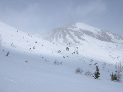 山頂から狭い林間を下る 1775mより下は緩斜面の広大な雪面 雪質は最高である