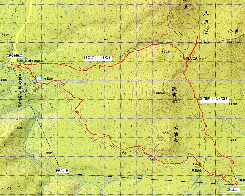 今回のコース 戻 る 登り 酸ヶ湯駐車場 AM8:40 〜 硫黄岳コース 〜 仙人岱ヒュッテ AM10:40 〜 下り 仙人岱ヒュッテ AM11:27 〜 睡蓮沼コース 〜 睡蓮沼登山口 PM12:14 〜 酸ヶ湯駐車場 PM 14:14