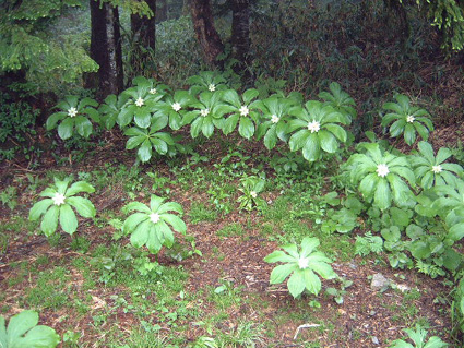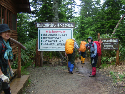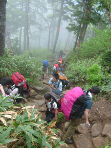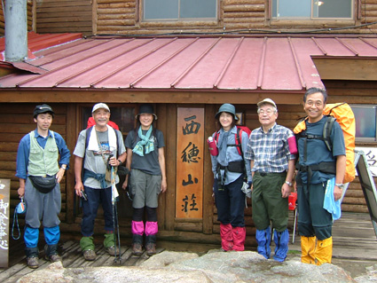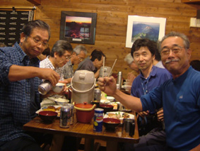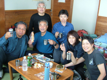 ![]() 新穂高ロープウェイ駅より笠ヶ岳方面 第二駐車場にて(ごんぞうさん・sakuraさん・Ariさん・Nabeちゃん・山男さん・Takahasiさん・SEI) ![]() 新穂高ロープウェイ しらかば平駅 西穂高口にて ![]() 登山道にキヌガサソウ 登山口 案内板 ![]() 登山道とNabeちゃん 錫杖岳(中央にロープウェイ駅) 山荘に到着(ごんぞうさん・Nabeちゃん・sakuraちゃん) ![]() 山荘到着 カンパ〜イ(HIMARAYAさん・ARIさん・Nabeちゃん・Takahasiさん・sakuraちゃん・ごんぞうさん) ![]() 夕 食 そ〜れ 飲むぞ ん〜 食べんべない 今にも泣き出しそうな夕暮れの模様 3日間雨の予報にも関わらず北ア(西穂高岳〜焼岳)登山のため新穂高温泉に着く 岐阜県飛騨市の山のお友達 山男さんが第二駐車場まで道案内の為に私たちを迎えてくれた 立ち話程度しか時間がとれないにも関わらず 地元のお酒と数々のおつまみをお供にと頂きしらかば平駅に向かう 山男さん お忙しい中ほんとうにありがとうございました m(_ _)m 駅でお待ちかねのビールを飲む 五臓六腑に染み渡る美味しい泡が食道から胃へと流れ夢の時間が到来した しかし空模様とにらめっこの行動を強いられた今回の登山 そんなことを言ってる時間は無いとロープウェイに乗り込む 穂高口に着き直ぐに登山道へと進む 空は今にも泣き出しそうだ 登山口のキヌガサソウが見事な咲きっぷりで並んでる 今年初めて目にする気品在る姿に見とれて軽やかに足を運ぶことが出来た 道中は登山者とすれ違うことが多く 表銀座の様相を目の当たりにする 遠望の峰は雲に覆われ展望は無いが 濡れた高山植物の発散する輝きが登山者に語りかけて来る不思議な世界を彷徨う 登山道は蒸し暑く風も殆どない 多くの登山者に紛れ込み厄介なやつが付いてきた 黒い小さな物体を目障りと追い払うが遠慮を知らないらしく・・お構いなしに抱きつき熱い吸引 痛いとピシャリと平手打ち 其処には何故か鮮血が飛び散るのでありました (-_-) 一時間強の登りで西穂山荘に到着 泣き出しそうな雨にも遭うことも無く部屋へと案内されました 部屋は角部屋で外の景色を眺めるのには最高の条件と喜ぶのもつかの間 厚い雲は視界を遮りやがて大粒の雨が屋根を打ちつける音に変わる それではと仲の良いお供にお付き合いを願おうと 山男さんに頂いた焼酎の栓を切り宴会に突入しました 山荘の料理に辿り着く頃はほろ酔い加減 道中の疲れも手伝って早めのお休みタイム 誰とも無く寝息を部屋に震撼させ明日の山旅を夢見る・・・北アの稜線に!おやすみなさい ・・・SEI 戻 る |