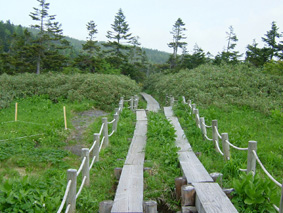 杢道の続く湿原には色とりどりの高山植物が咲き乱れる