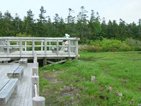 湿原には休憩が出来るデッキが所々に設置されハイカーが休む姿が見られる