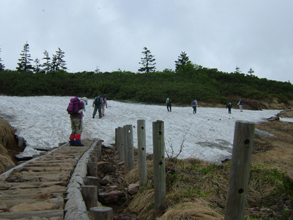 赤ヤシオ 雪渓を行く登山者 どこまでも杢道
