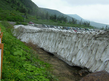 アスピーテラインに在る県境(秋田県 ー 岩手県) 駐車場の残雪 地元で教えていただいた山菜(サク)
